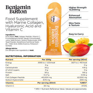 各30mlのサシェには高品質のマリンコラーゲン10,000mgとビタミンC60mgが含まれており、ナッツ、グルテン、ラクトース、大豆、人工添加物および甘味料を含まず、ハラール認証を受けています。各サシェは5gのタンパク質で40カロリーです。