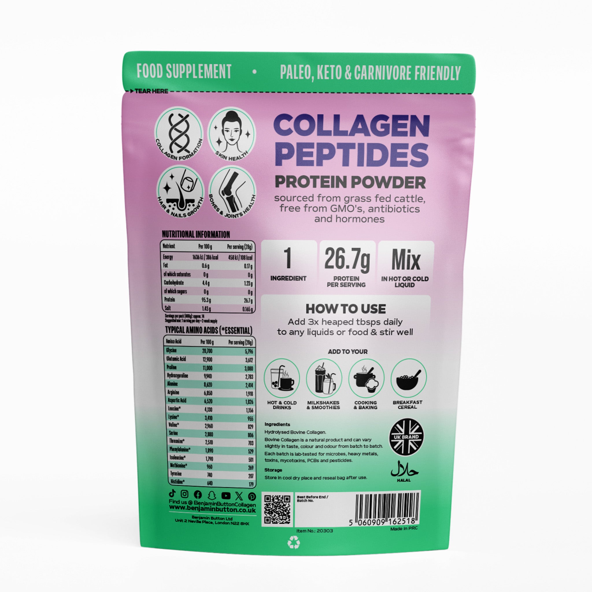 - Rik på glycin & prolin för att stödja hudens elasticitet, hårväxt och ledhälsa