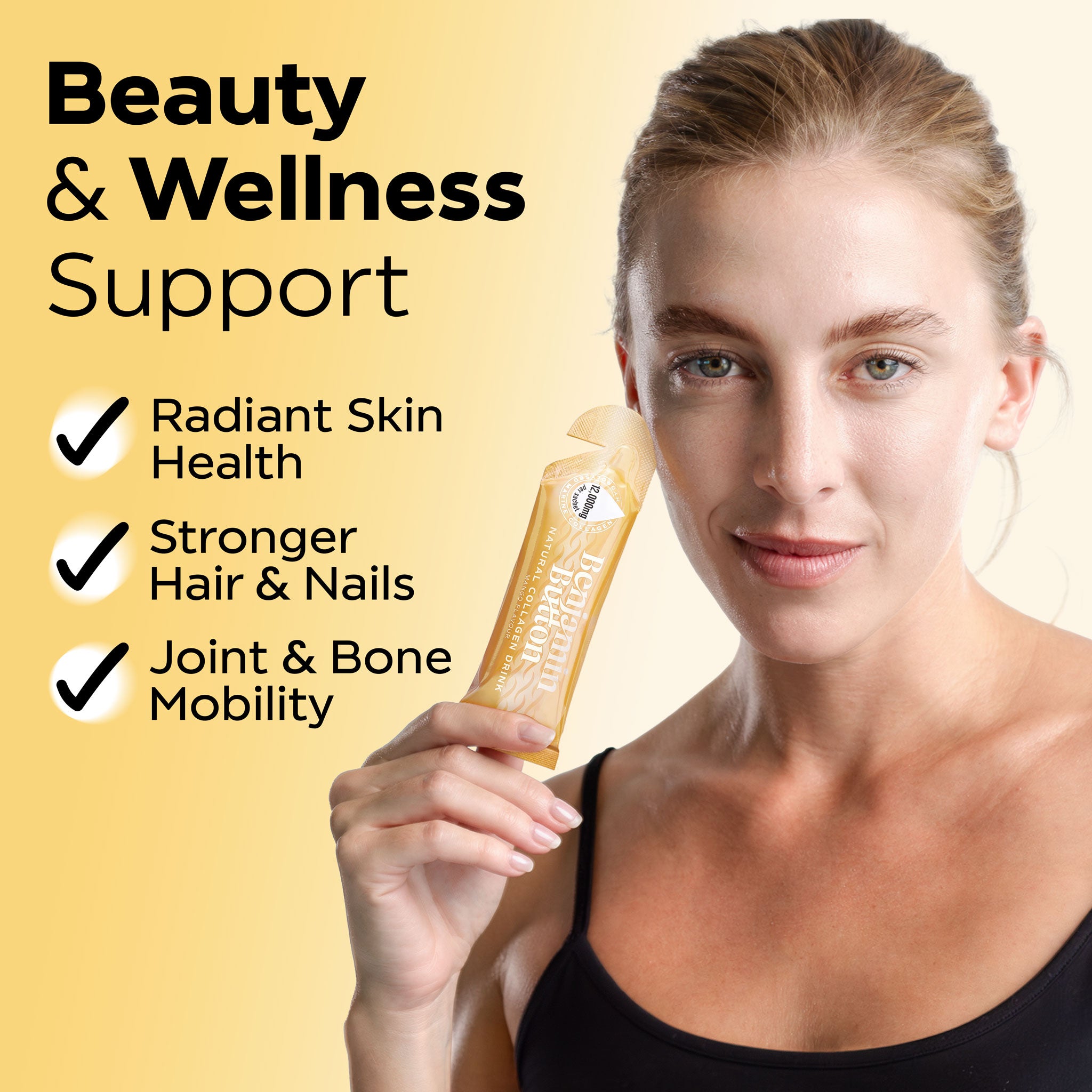 A ready‑to‑drink 30ml sachet delivering 12,000mg hydrolysed marine collagen with Vitamin C and Hyaluronic Acid to support skin hydration, elasticity, hair and joint health. The natural mango flavour makes it an easy daily beauty and wellness boost.